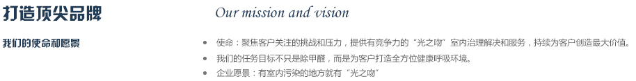 2012年公司斥巨資從德國(guó)專業(yè)空氣研發(fā)實(shí)驗(yàn)室引進(jìn)銳鈦型納米二氧化鈦研發(fā)成果,同時(shí)與國(guó)內(nèi)知名高校進(jìn)行合作,成立光之吻”品牌,致力于為人類創(chuàng)作純凈,健康的呼吸環(huán)境,成為你身邊的健康衛(wèi)士,實(shí)現(xiàn)365天健康呼吸的夢(mèng)想,目前是同類產(chǎn)品中最有競(jìng)爭(zhēng)力的品牌之一。